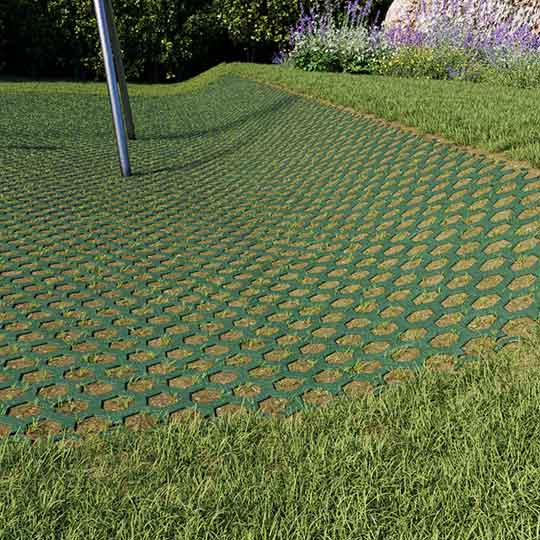 Grass Grid Hexagon® tiles are sustainable rubber grid plates with a honeycomb structure designed to create safe, stable and fully grassable surfaces—ideal for playgrounds, parks, slopes and natural landscapes.